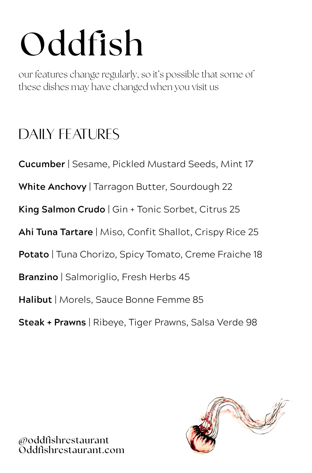 Welcome to Oddfish. Each day, we have two food menus that are continuously changing due to the season as well as the daily visits by many of our suppliers. Our seasonal menu contains many of our signature dishes that get tweaked according to the season in the sea as well as on land. The daily menu is exactly that for it is contingent on what arrives that day. Each day we get to create and share with you the best of that day. The menus below are from a recent evening’s service.